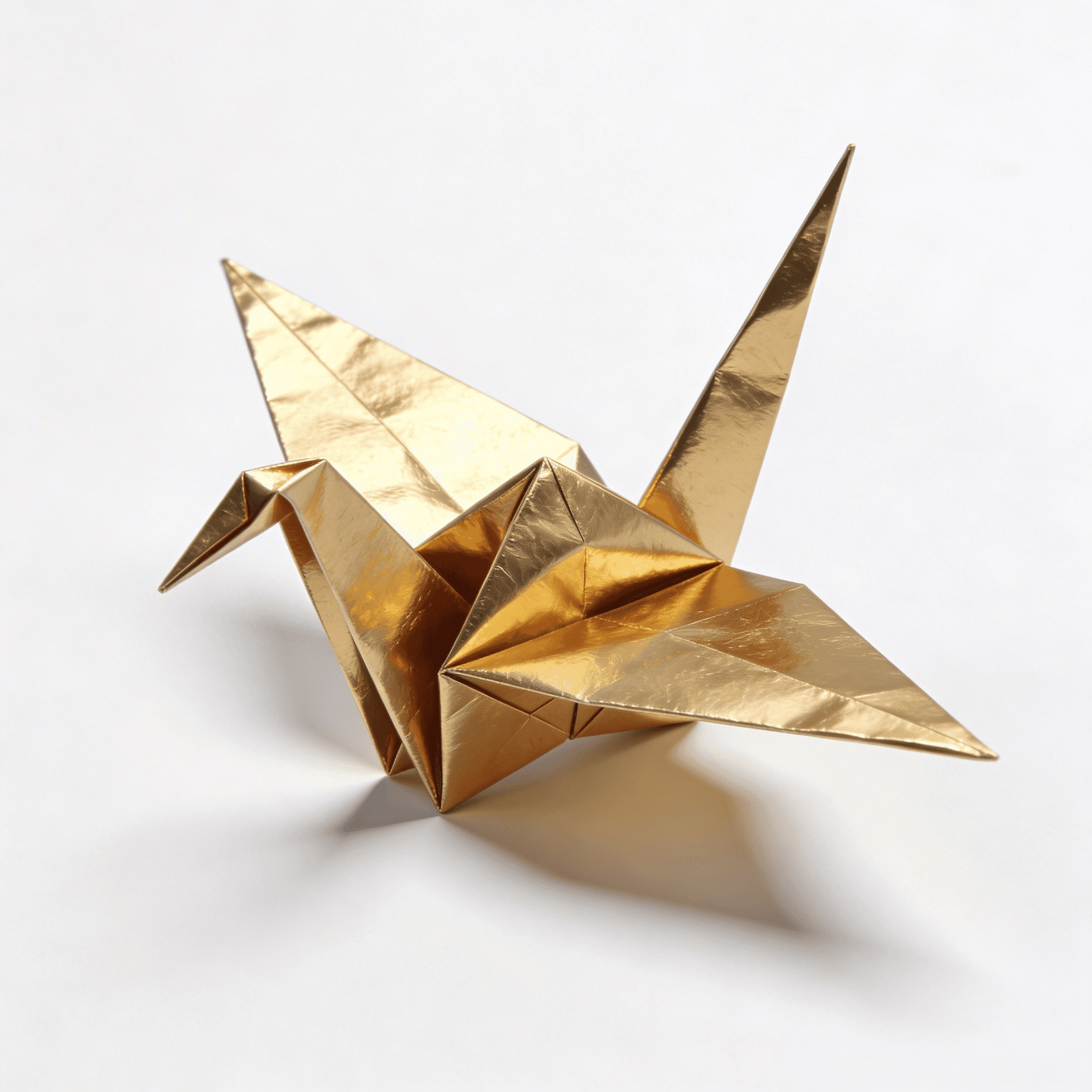 3D paper crane origami, metallic gold foil paper, crisp geometric folds, casting shadow, minimalist white surface --ar 1:1 --style raw